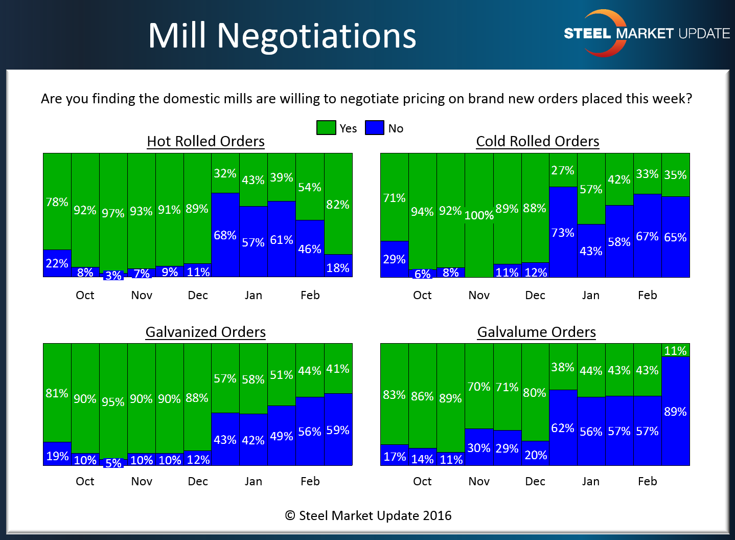 Cold rolled, galvanized and Galvalume were less mill sensitive with 35 percent of those responding to our CR inquiry reporting the mills as willing to negotiate. For Galvanized, 41 percent reported the mills as willing to negotiate spot pricing and Galvalume dropped to 11 percent of those responding to our survey reporting AZ prices as negotiable. Based on the results seen, we believe the spread between hot rolled and the other flat rolled products base pricing will continue to be wider than historical levels.