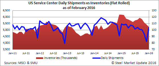 Total inventories ended the month at 7,954,700 tons, and based on the daily shipment rate of 152,700 tons per day, the month ended with 2.6 months worth of inventories on the floors of the service centers. The 2.6 months supply figure is down from 3.0 months reported at the end of December and better than the 2.8 months in January 2015.