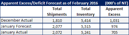 When it came to inventories of flat rolled products, we originally forecast total inventories would rise in January to 5,515,000 tons. Inventories actually declined from December to January to 5,241,000 tons. This resulted in a much greater decline in our Apparent Excess figure, to 705,000 tons of excess steel. We will go into greater detail as to what this means and we will provide our updated forecast for February, March, April, May and June to our Premium members on Friday.