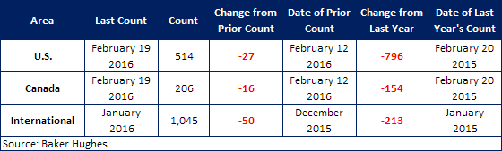 According to Baker Hughes data from February 19, 2016, the U.S rig count for the week was 514 rigs exploring for or developing oil or natural gas. This is a decrease of 27 rigs when compared to last week, with oil rigs down 26 to 413 rigs, gas rigs down 1 to 101 rigs, and miscellaneous rigs unchanged at 0 rigs. Compared to this time last year, the 514 count is down 796 rigs, with oil rigs down 606, gas rigs down 188, and miscellaneous rigs down 2.