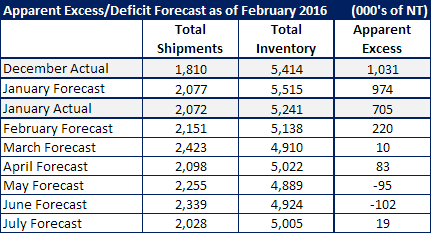 The lower flat rolled inventory levels affects our Apparent Inventory Excess forecast. We had forecast a reduction in our Apparent Excess from 1,031,000 tons at the end of December to 974,000 tons (forecast) at the end of January. We got the direction correct but missed the final number. Instead of Apparent Excess at 974,000 it dropped to 705,000 tons.