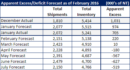 February inventories are forecast to drop to 5,138,000 which would take our Apparent Inventory Excess down to 220,000 tons. Our forecast is calling for daily receipts to be 10 percent lower than the 3 year average for flat rolled products (January was 17.3 percent lower).
