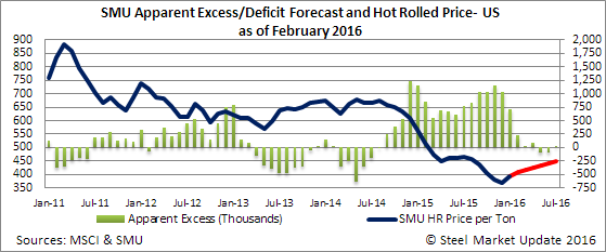 As part of your Premium level service, Steel Market Update (SMU) analyzes the service center shipment and inventory data and provides a short term forecast for carbon flat rolled steel shipments, inventories and how they will impact pricing over the next four months. This is done through a proprietary model and the results provided are called the Service Center Apparent Excess/Deficit forecast.