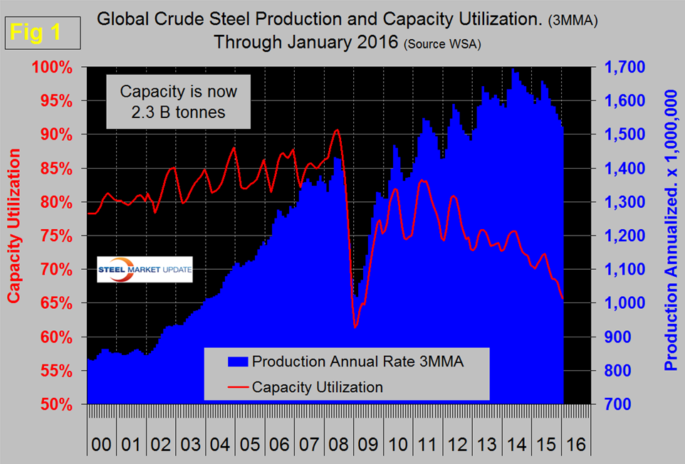 Global steel production and capacity utilization, January 2016