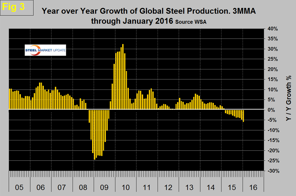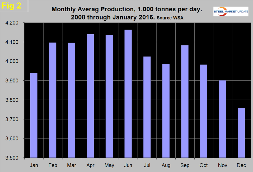 Global steel production in the 12 months of 2015 totaled 1.595 billion tonnes with a capacity of 2.33 billion tonnes. The WSA has made no downward revision to capacity as production fell in the course of 2015 making capacity utilization look increasingly dismal. Production in the month of January was 127,840,000 tonnes, up from 126,404,000 in December. On a tons per day basis production was 4.124 million tonnes and down from 2015’s high point of 4.518 in April. If we look at the three month moving average and plot it over time we see that there has been a significant decline in the second half of the year since and including 2010 which usually extends into February of the next year, after which production kicks up rapidly (Figure 1).