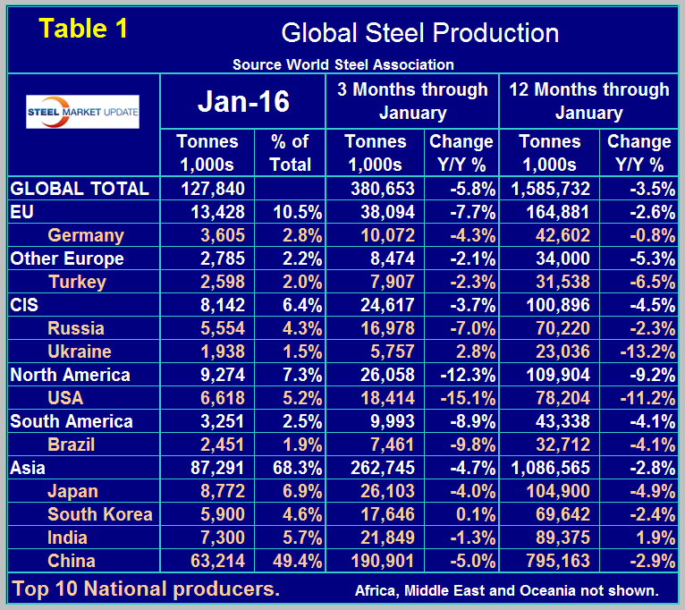 China accounted for 49.4 percent of global production in January, down from 50.8 percent in December. Asia as a whole, including India, accounted for 68.3 percent in January. China continues to state that redundant capacity will be closed and that the central government will provide support in the form of funding for re-assigned workers and for asset write-offs. If the WSA is keeping up with the situation then no actual capacity has been shuttered or, if it has new capacity has replaced it.