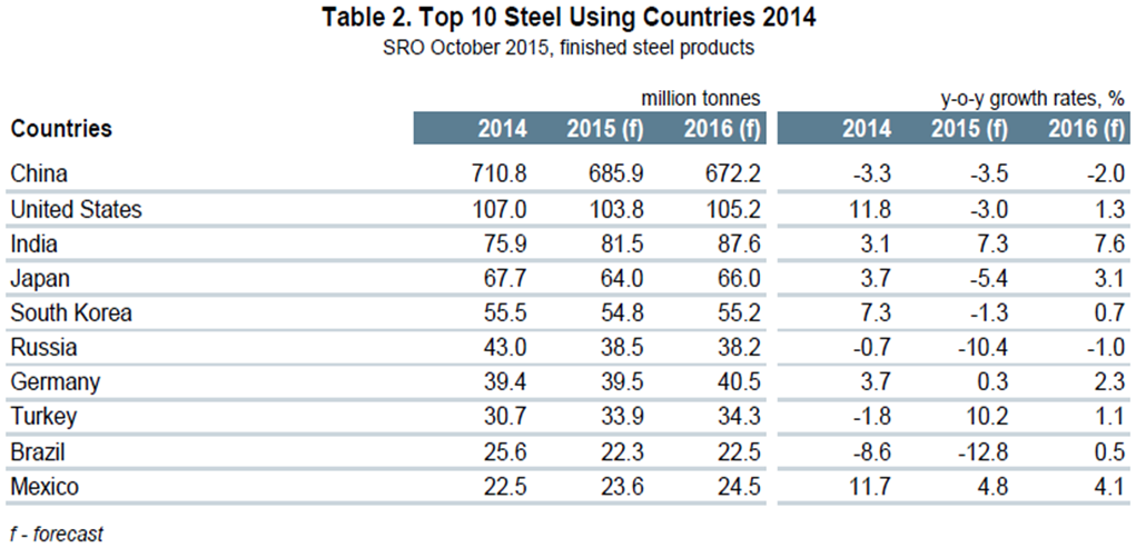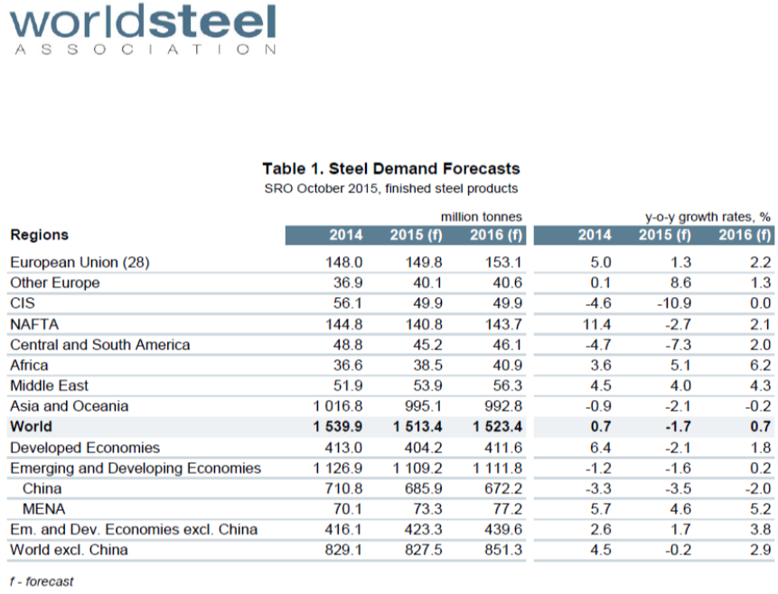 In October the World Steel Association published their latest Short Range Outlook, (SRO) for apparent steel consumption in 2015 and 2016. We will leave these in our monthly updates until the April 2016 revision is released even though this forecast looks increasingly wrong. (Note this forecast is steel consumption, not crude steel production which is the main thrust of what you are reading now.) The first table of the SRO is by region and the second for the top 10 consuming nations. At the global level consumption must equal production in the long term with inventory adjustments interfering with that relationship in the short term. WSA forecast a 1.7 percent contraction in demand in 2015 followed by a 0.7 percent expansion this year. Based on this analysis by the WSA, NAFTA will decline by 2.7 percent this year and grow by 2.1 percent next year with the US contracting by 3.0 percent and growing by 1.3 percent on the same basis.