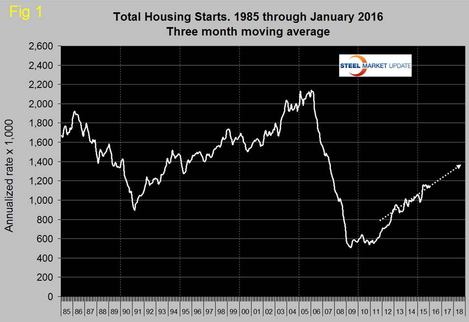 Total housing starts in January were at an annual rate of 1,099,000 which was down from 1,143,000 in December. Since April 2015, total monthly starts annualized have ranged from 1,062,000 to 1,211,000 with the high month being June. In January the three month moving average (3MMA) was 1,139,000 which was up from 1,130,000 in December. The 3MMA has been really tight since last June ranging between 1,130,000 and 1,160,000. August 2015 at 1,160,000 had the highest 3MMA since the recession. Total starts are still on track to reach 1.4 million units annualized by the end of 2018 (Figure 1).