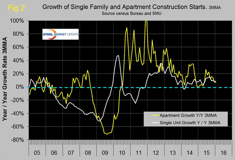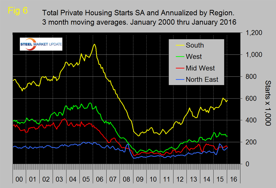 In the first half of 2015 the North East had the highest growth rate driven as mentioned above by apartment construction in New York state but now that has cooled. The South had the most consistent growth in 2015.