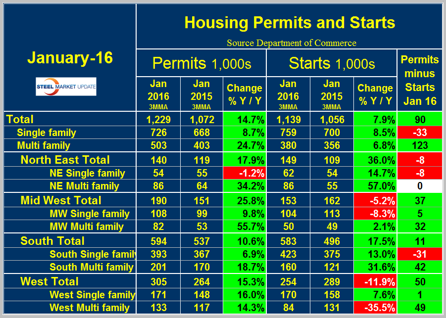 Permit data is considered to be a leading indicator for starts. If permits exceed starts then there should be an acceleration in construction and vice versa. Total permits in January were at an annual rate of 1,202,000 with a 3MMA of 1,229,000. Permits have been well ahead of starts for the last three months (Figure 4), however it looks as though permits don’t always lead to ground breaking and sometimes, as in 2013, there can be quite a wide divergence.