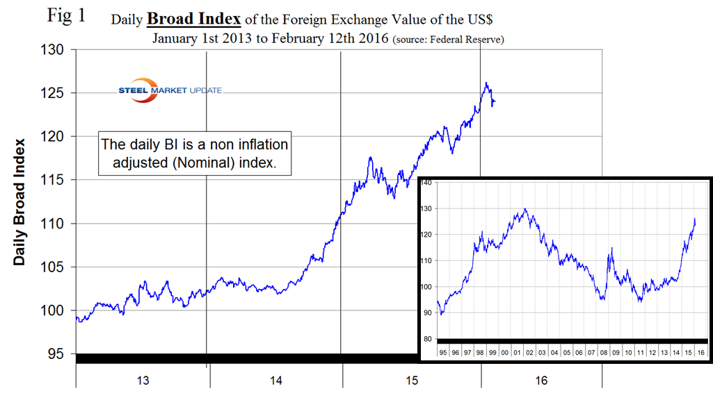 The latest data for the Broad Index value of the US $ against the currencies of our major trading partners was February 12th, which was nine days behind the individual steel trading currency data that we are presenting here. On February 12th the daily BI at 124.11, down by 1.2 percent in the previous 30 days. Figure 1 shows the daily BI since January 1st 2013 with an insert to show how this latest period fits into the longer term picture since January 1995.