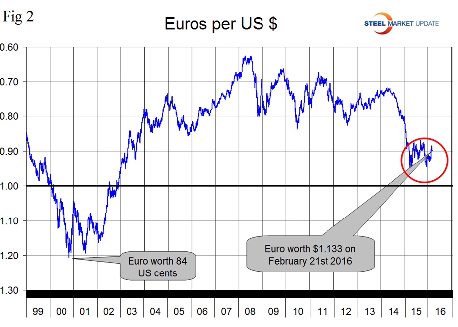 We regard strengthening of the US Dollar as negative and weakening as positive because the effect on net imports. In 2014, 25 percent of the U.S. economy had some involvement in international trade therefore currency swings can have a large effects on the economy in general and of the steel industry in particular. In the 30 days before our January 25th update the dollar strengthened against 14 of the 16 currencies under consideration as traders increased their dollar positions to obtain a better return on their assets. In the 30 days before this update of February 21st the dollar did a complete reversal and weakened against 13 of the 16 steel and raw materials trading currencies. We saw a harbinger of this move at the 7 day level in our January 25th report. We assume that currency traders over bought the dollar and then decided to reduce their positions. Looking at the 7 day level in this data the dollar is swinging back the other way to some extent with a strengthening against 9 of the 16 steel trading currencies. However it looks from Figure 1 as though this recent weakening is a fairly significant move in a historical context.