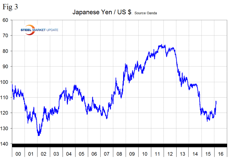 Figure 3 shows the value of the Yen since January 2000. The Yen has strengthened by 9.1 percent in 3 months and 4.1 percent in the last month to close at 112.5/US $ on February 21st.