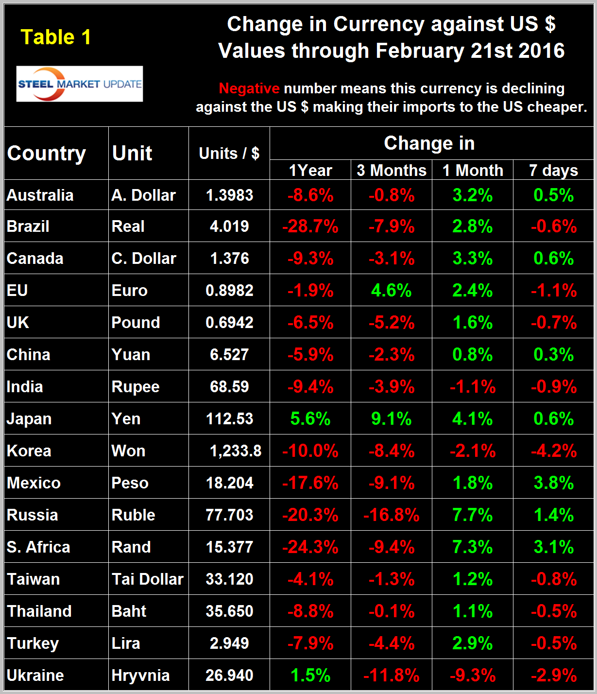 Table 1 shows the change in currencies of 16 steel and iron ore trading nations in one year, three months, one month and seven days for each currency and is color coded to indicate strengthening of the dollar in red and weakening in green.