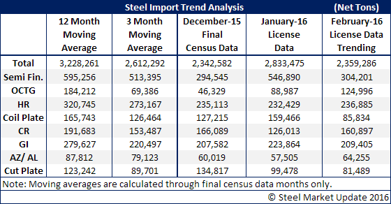 The U.S. Department of Commerce updated foreign steel import license data this afternoon (February 23rd). Based on a daily license rate of 81,355 tons, February is trending toward 2.2-2.3 million tons. This is slightly lower than the 2.4 million ton pace we saw based on license data through the 16th of February. At 2.3 million tons, if it holds up when the final count is in, it will be well below both the 12 month-moving average of 3.2 million tons as well as the 3 month moving average of 2.6 million.