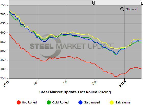 SMU Note: Below is a graphic showing our hot rolled, cold rolled, galvanized, and Galvalume price history. To use the graphs interactive capabilities, you must view it on our website here. If you need help navigating the website or need to know your login information, contact us at info@SteelMarketUpdate.com or by calling 800-432-3475.