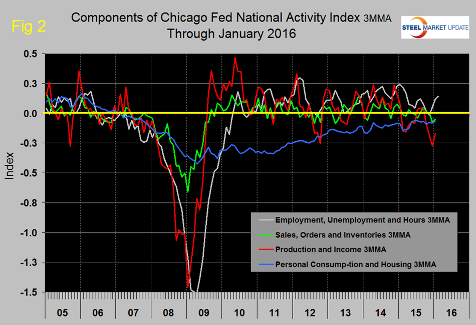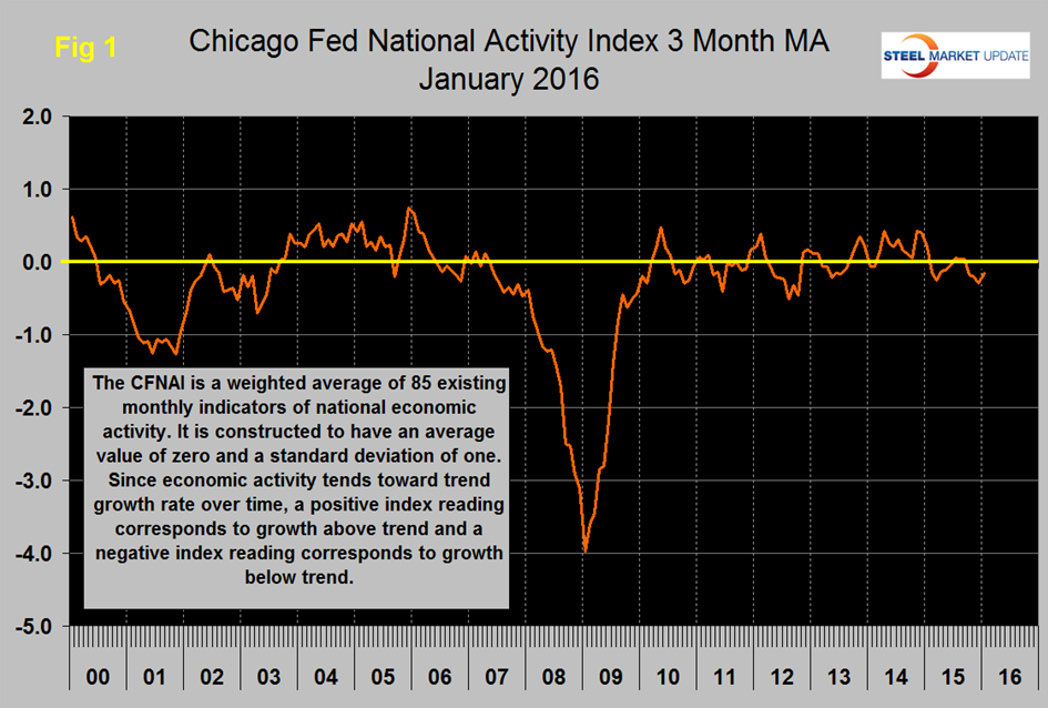 The following is the Chicago Federal Reserve statement followed by our own graphical analysis. The CFNAI is an excellent reality check for much of the economic analysis that we routinely provide in The Steel Market Update and is also a reasonably good predictor of the direction of steel demand with a six to nine month lead. For example by the time the steel market went off the cliff in September 2008, the CFNAI had been signaling an increasingly severe problem for eight months. Then in the first Q of 2009 the CFNAI was recovering as steel supply was still going south. An explanation of the Index is provided at the end of this piece.