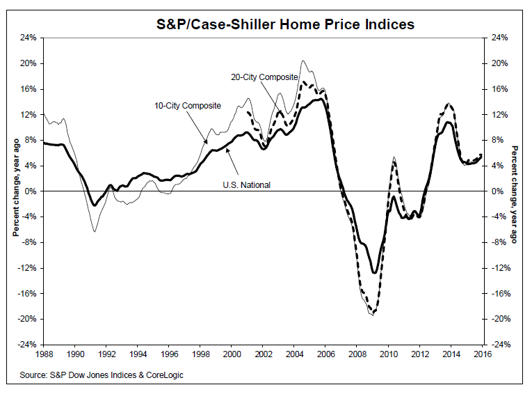 Home prices for December were released by the S&P Dow Jones Indices on February 23 and show 5.4 percent annual increase in December 2015 versus a 5.2 percent increase in November 2015.