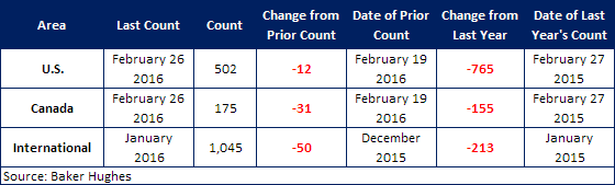 According to Baker Hughes data from February 26, 2016, the U.S rig count for the week was 502 rigs exploring for or developing oil or natural gas. This is a decrease of 12 rigs when compared to last week, with oil rigs down 13 to 400 rigs, gas rigs up 1 to 102 rigs, and miscellaneous rigs unchanged at 0 rigs. Compared to this time last year, the 502 count is down 765 rigs, with oil rigs down 586, gas rigs down 178, and miscellaneous rigs down 1.