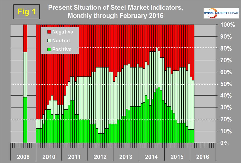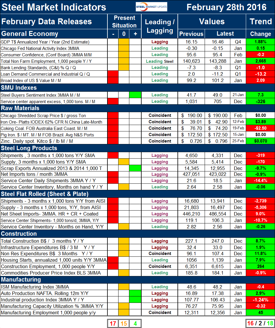 There was an increase of one negative since we last published this review on February 2nd, and a decrease of one in what we consider to be normal or neutral. We currently regard 4 of the 36 indicators to be positive, 15 to be neutral and 17 to be negative on a historical basis. Changes in the last month were as follows; the Chicago Fed National Activity Index, (CFNAI) which fell below negative 0.2 (our normal to poor threshold) in its December data returned to neutral in January. The first quarter report from the Federal Reserve dealing with bank lending standards produced a negative situation for demand for commercial and industrial loans, down from neutral in Q4 2015. Shipments of flat products from service centers declined in the January data and fell into our historically poor category. There were no changes to the present situation of construction and manufacturing indicators.