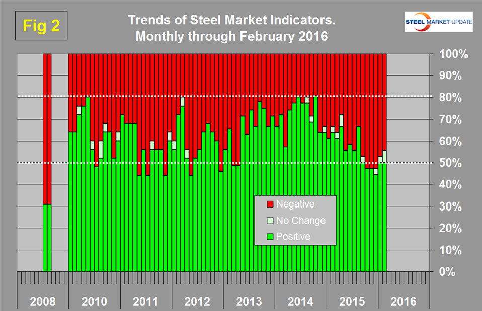 Figure 2 shows the pre-recession situation at the far left of the chart. In August 2008 over 2/3, (69.2 percent) of our indicators were trending negative and the steel market crashed in September of that year.
