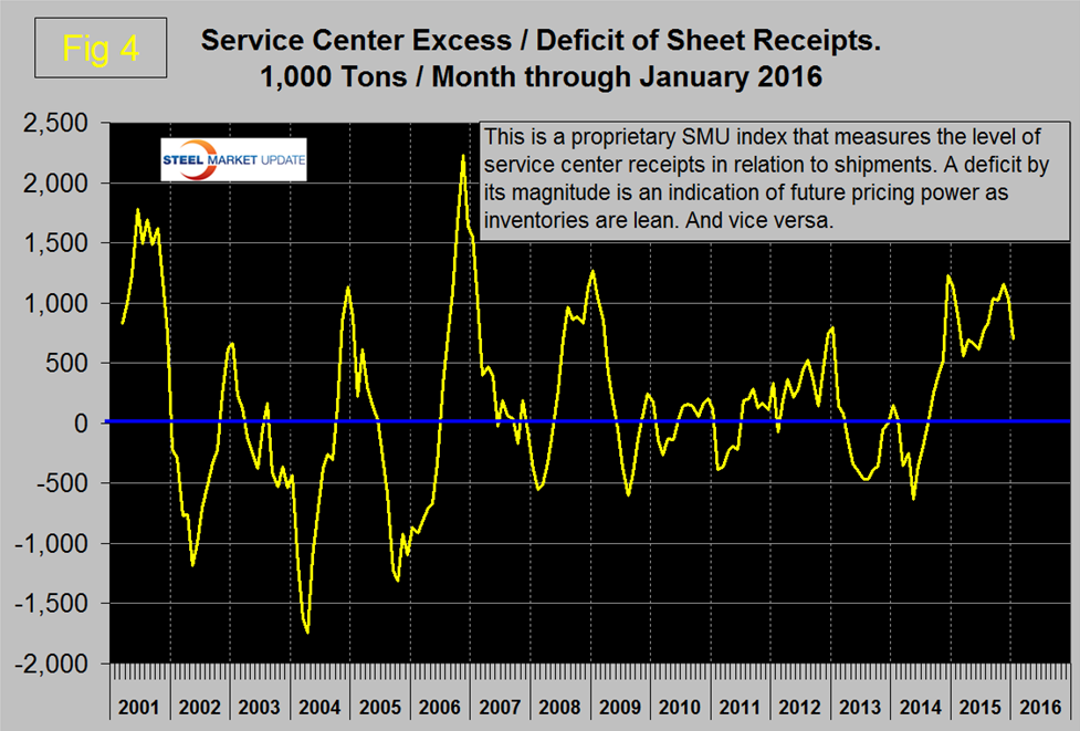 The calculation of service center excess inventory of sheet products which had trended positive in the October data trended negative in November then returned to positive in December and January. This excess is very high by historical standards which we regard as a leading indicator of weak pricing power (Figure 4).