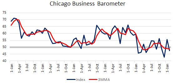 The Chicago Business Barometer surprised economists with an 8 point tumble to 47.6 in February after increasing to 55.6 in January. Sharp declines in production in new orders contributed to the weaker readings. Economists expected a milder decline to 53; a reading below 50 indicates a contraction in business activity.