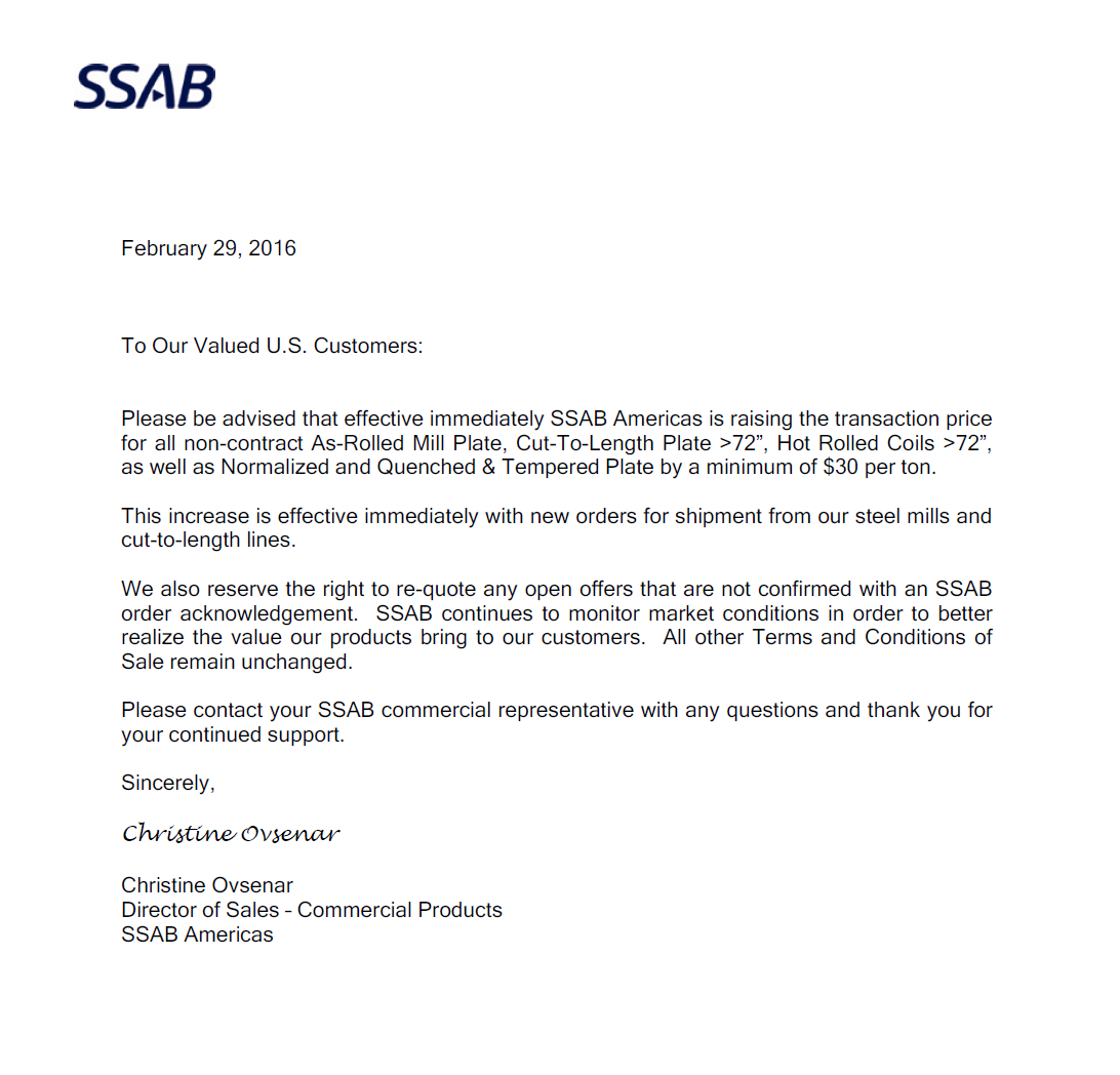 SSAB, which is known primarily as a plate supplier, announced a $30 per ton price increase on plate and hot rolled coil in the United States and a $40 per ton price increase on hot rolled. The SSAB increases were sent via an emailed letter to their customers. The letter began, “Please be advised that effective immediately SSAB Americas is raising the transaction price for all non-contract As-Rolled Mill Plate, Cut-To-Length Plate >72”, Hot Rolled Coils >72”, as well as Normalized and Quenched & Tempered Plate by a minimum of $30 per ton.” The letter advised the increases were to be effective immediately on all new orders.