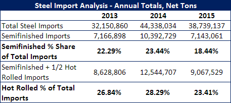 The amount of tonnage of slabs and hot rolled coil is not insignificant and combined represents anywhere from one quarter to as much as one third of the total foreign steel imports during any specific month.