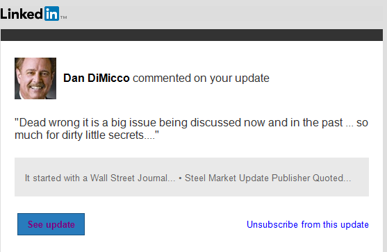 Dan DiMicco, retired CEO of Nucor responded to the comment with, “Dead wrong it is a big issue being discussed now and in the past … so much for dirty little secrets….”
