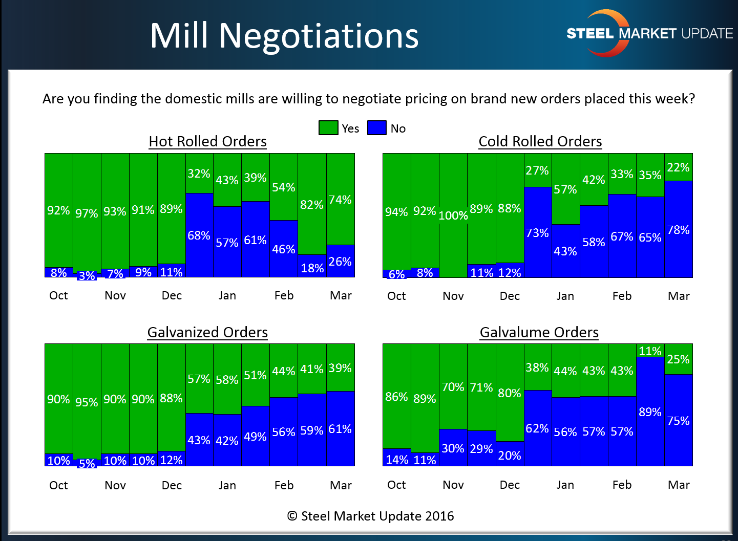 Cold rolled saw 22 percent of our respondents reporting the mills as willing to negotiate pricing. At the beginning of January, 57 percent reported the mills as willing to negotiate CRC pricing.