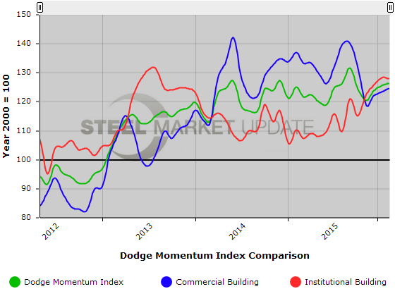 Below is a graph showing the history of the Dodge Momentum Index. You will need to view the graph on our website to use it’s interactive features, you can do so by clicking here. If you need assistance with either logging in or navigating the website, please contact our office at 800-432-3475 or info@SteelMarketUpdate.com.