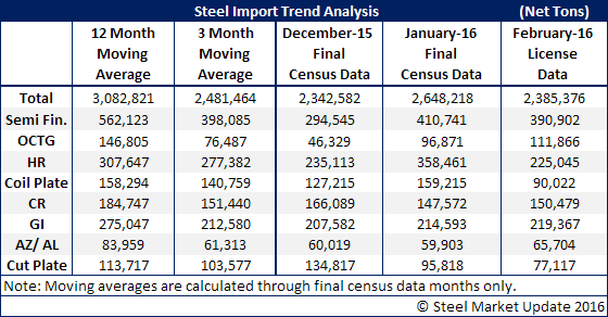 February 2016 license data still suggests import levels will drop to approximately 2.2-2.4 million net tons. Here is what the data looks like based on the most recent US DOC numbers.