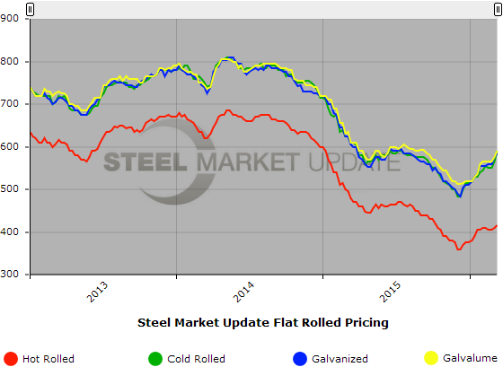 SMU Note: Below is a graphic showing our hot rolled, cold rolled, galvanized, and Galvalume price history. To use the graphs interactive capabilities, you must view it on our website here. If you need help navigating the website or need to know your login information, contact us at info@SteelMarketUpdate.com or by calling 800-432-3475.