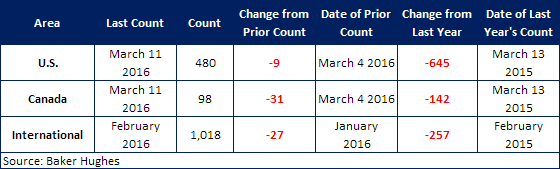 According to Baker Hughes data from March 11, 2016, the U.S rig count for the week was 480 rigs exploring for or developing oil or natural gas. This is a decrease of 9 rigs when compared to last week, with oil rigs down 6 to 386 rigs, gas rigs down 3 to 94 rigs, and miscellaneous rigs unchanged at 0 rigs. Compared to this time last year, the 480 count is down 645 rigs, with oil rigs down 480, gas rigs down 163, and miscellaneous rigs down 2.
