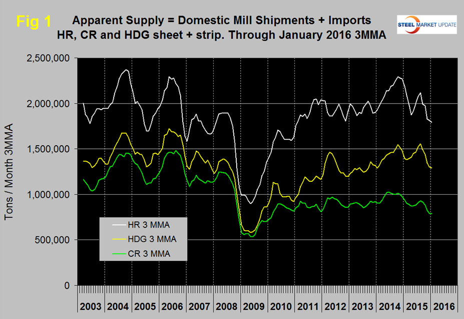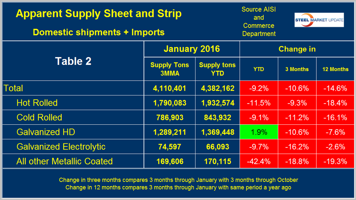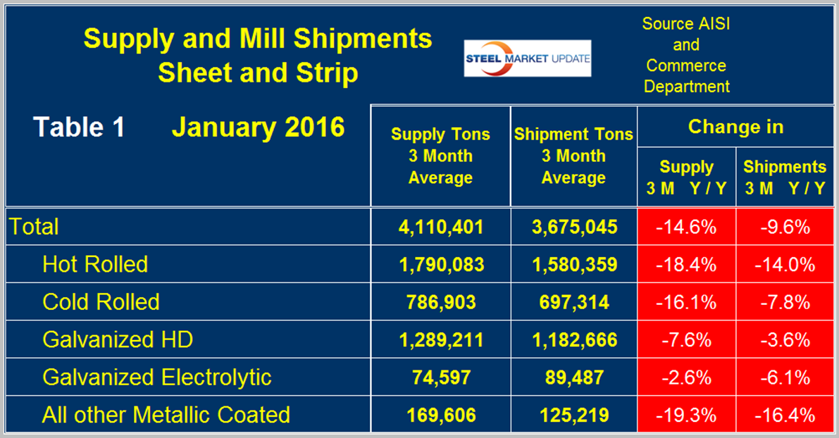 Table 1 shows both supply and mill shipments of sheet products (shipments includes exports) side by side as a three month average through January, for both 2015 and 2016.