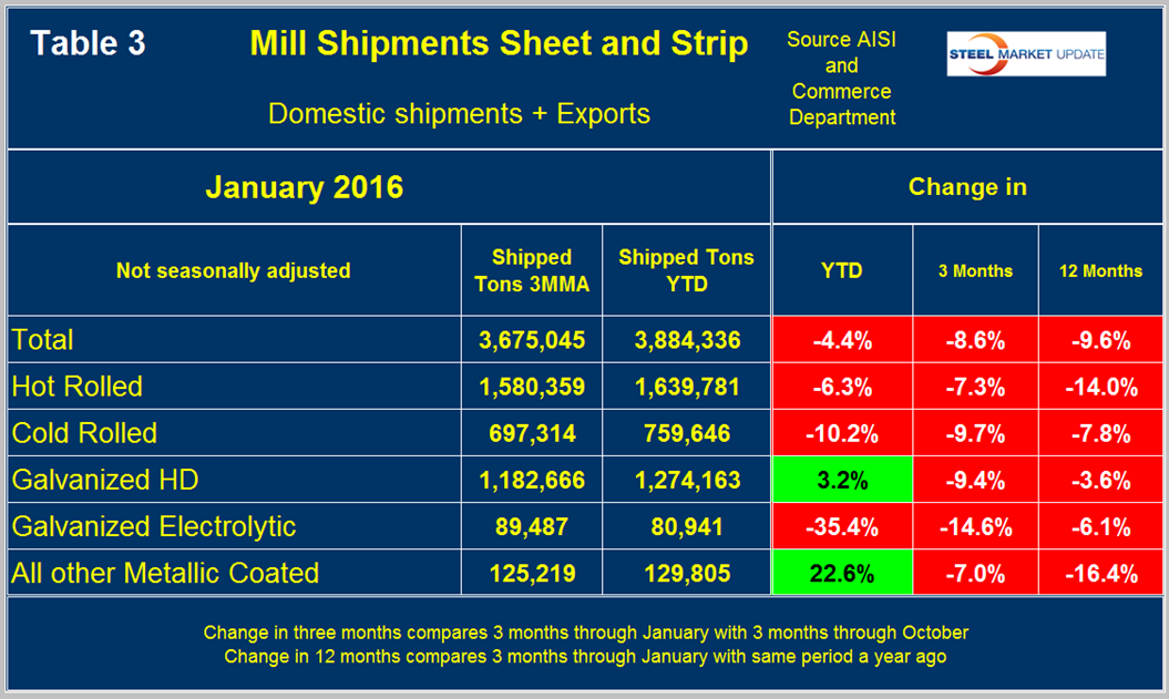 Table 3 shows that total shipments of sheet and strip products including hot rolled, cold rolled and all coated products were down by 9.6 percent in 3 months through January year over year and down by 8.6 percent comparing three months through January with three months through October.