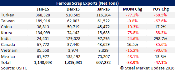 Total January ferrous scrap exports were 53.9 percent lower than previous month and 47.1 percent lower than the same month one year ago. The last time total ferrous scrap exports were this low was in September 2001 when 578,952 tons of ferrous scrap was exported. The most significant change month over month went to Turkey, with a decrease of 394,301 tons from December to January and at the lowest levels seen since April 2013.
