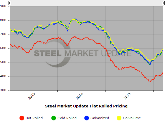 SMU Note: Below is a graphic showing our hot rolled, cold rolled, galvanized, and Galvalume price history. To use the graphs interactive capabilities, you must view it on our website here. If you need help navigating the website or need to know your login information, contact us at info@SteelMarketUpdate.com or by calling 800-432-3475.
