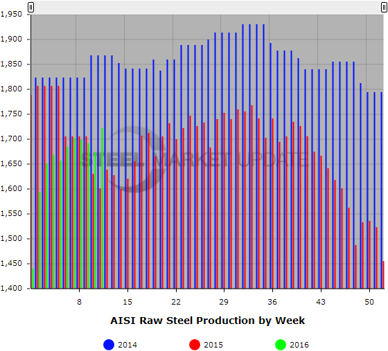 For the week ending March 12, 2016, the American Iron & Steel Institute (AISI) estimated the U.S. steel industry produced 1,722,000 net tons of raw steel, a 2.9 percent increase over the previous week and a 7.6 percent increase over the same week one year ago. The estimated capacity utilization rate is 73.6 percent, up from 71.5 percent last week and up from 67.7 percent this time last year (note that the capacity utilization rates in 2016 are based on new lower total capabilities with the removal of US Steel Fairfield from the mix.)