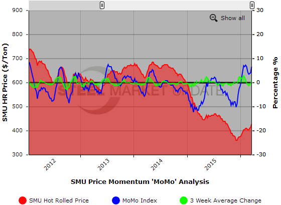 The graph below demonstrates the relationship between the SMU hot rolled coil price, the SMU Price MoMo Index, and the three week moving average change in the MoMo Index. As published in our Tuesday evening issue, the SMU HRC price range for this week is $410-$450 per ton with an average price of $430, up $15 per ton from from last week.
