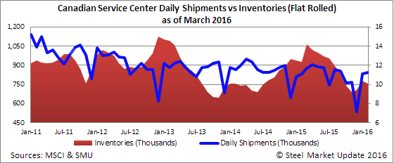 Canadian shipments for plate products in the month of February were 71,400 tons, a decrease of 9.0 percent from the previous month and a decrease of 9.8 percent from February 2015. Inventories at the end of the month were 184,000 tons, a decrease of 5.7 percent from last month and a decrease of 44.3 percent from the same month one year ago. The daily average receipt rate for February was 2,867 tons per day, down from 4,030 tons per day the month before. Plate inventories ended the month at 2.6 months, up from 2.5 months last month.