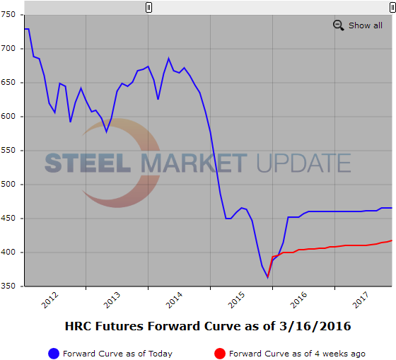 Below is a graphic of the HRC Futures Forward Curve. The interactive capabilities of the graph can only be used in Steel Market Update website here. If you have any issues logging in or navigating the website please contact us at info@steelmarketupdate.com or (800) 432 3475.