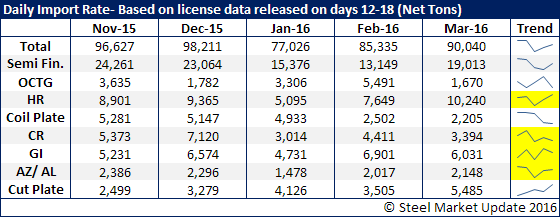 The U.S. Department of Commerce updated foreign steel import license data earlier this week. The trend is for March steel imports to come in around 2.4-2.7 million net tons or in line with what we saw during the months of January and February 2016.