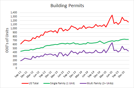 Single-family construction surged 7.2 percent to an annualized rate of 822,000. Multi-family housing of 5 units or more increased 2.4 percent for an annualized rate of 341,000. Apartment housing has been a favored choice for young adults saddled student debt and little savings. The surge in single family housing potentially signals stronger confidence in the economy.