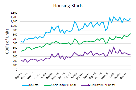 Single-family construction surged 7.2 percent to an annualized rate of 822,000. Multi-family housing of 5 units or more increased 2.4 percent for an annualized rate of 341,000. Apartment housing has been a favored choice for young adults saddled student debt and little savings. The surge in single family housing potentially signals stronger confidence in the economy.