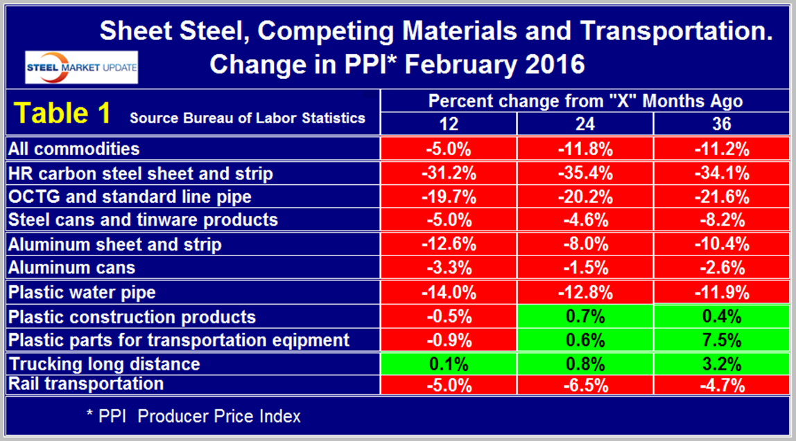 On a first macro comparison Table 1 for February has exactly the same gain/loss pattern as shown by the color codes as it did in our November update except that in the latest data the cost of truck transportation had a small increase. Our analysis of the PPI data shows that commodity prices as a whole declined by 5.0 percent in 12 months through February which was a slower rate of decline than in the 24 and 36 month comparisons. Commodity prices in general were back to where they were at the beginning of 2010. A rising $ will put downward pressure on commodity prices. It is evident from Table 1 that carbon steel sheet has declined much more than aluminum sheet which has resulted in steel cans gaining a competitive advantage over aluminum cans. In a similar vein steel pipe has declined much more than plastic pipe. AMM reported on February 5th that the collapse of steel and plastic prices has strengthened the position that each holds at opposite ends of the oil and gas supply chain. Steel dominates in most oil production and refining applications as plastic is used more often in distribution, mostly of natural gas, to end users. An analyst with Cleveland based Freedom Group Inc., told AMM that plastic made significant inroads in oil and gas pipe applications in 2009 through 2012 but since then inroads have slowed.