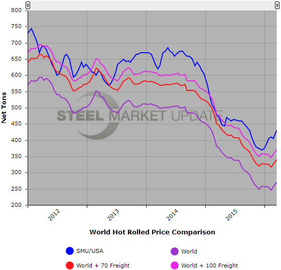 The following calculation is used by Steel Market Update to identify the spread between world hot rolled export prices as determined by SteelBenchmarker and domestic (US) hot rolled prices as published by SMU. Steel Market Update compares the world hot rolled export price to which dollars are added for freight, handling, trader margin, etc. The number generated is then compared to the spot (FOB Mill) domestic hot rolled price using the SMU Hot Rolled Index average for this week, with the result being the spread between domestic and world hot rolled coil prices. This is a “theoretical” calculation as freight costs, trader margin and other costs can fluctuate ultimately influencing the true market spread.