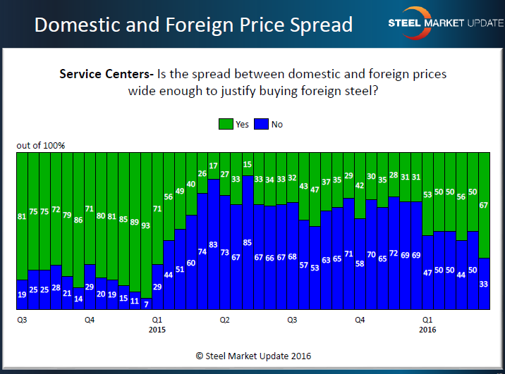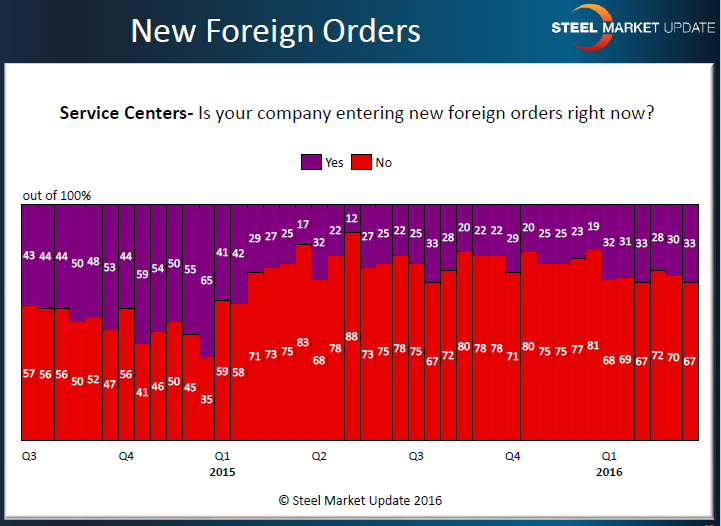 Even though the price spread has been widening recently our respondents aren’t necessarily jumping on the foreign steel bandwagon (yet). We asked our respondents if their company was entering new foreign steel orders right now and only 33 percent of the service centers responded “yes” while 30 percent of the end users reported placing new foreign orders.