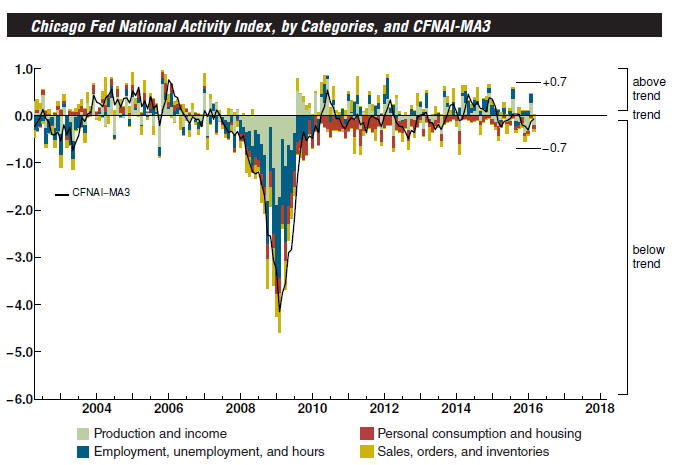 The index is a weighted average of 85 indicators of national economic activity drawn from four broad categories of data: 1) production and income; 2) employment, unemployment, and hours; 3) personal consumption and housing; and 4) sales, orders, and inventories. A zero value for the index indicates that the national economy is expanding at its historical trend rate of growth; negative values indicate below-average growth; and positive values indicate above-average growth.